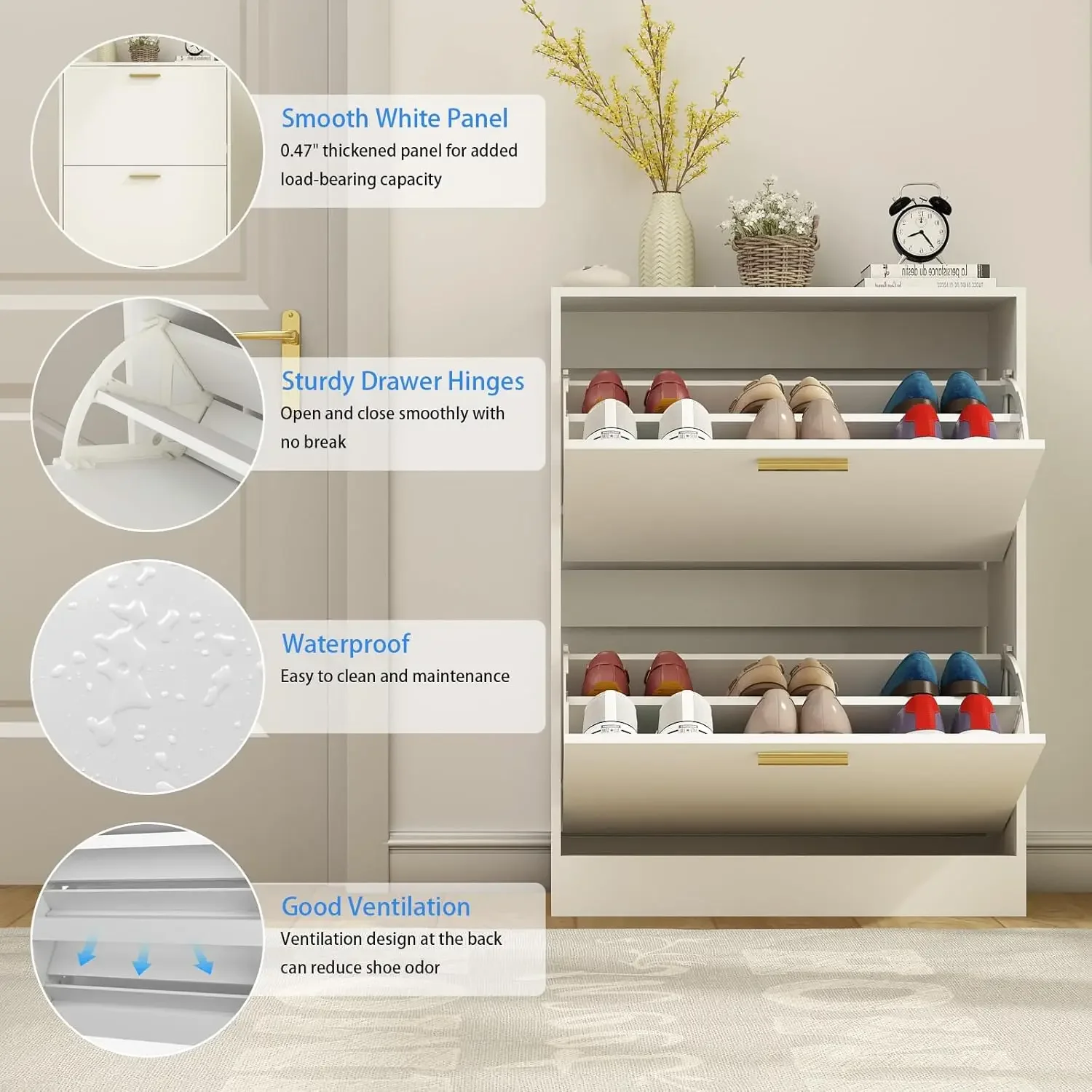 Make the most of narrow spaces with this slim entryway shoe cabinet. Its sleek, space-saving design tucks neatly against the wall while keeping your footwear organized and out of sight. With modern styling and multiple compartments, it’s the perfect blend of function and flair for any entryway.